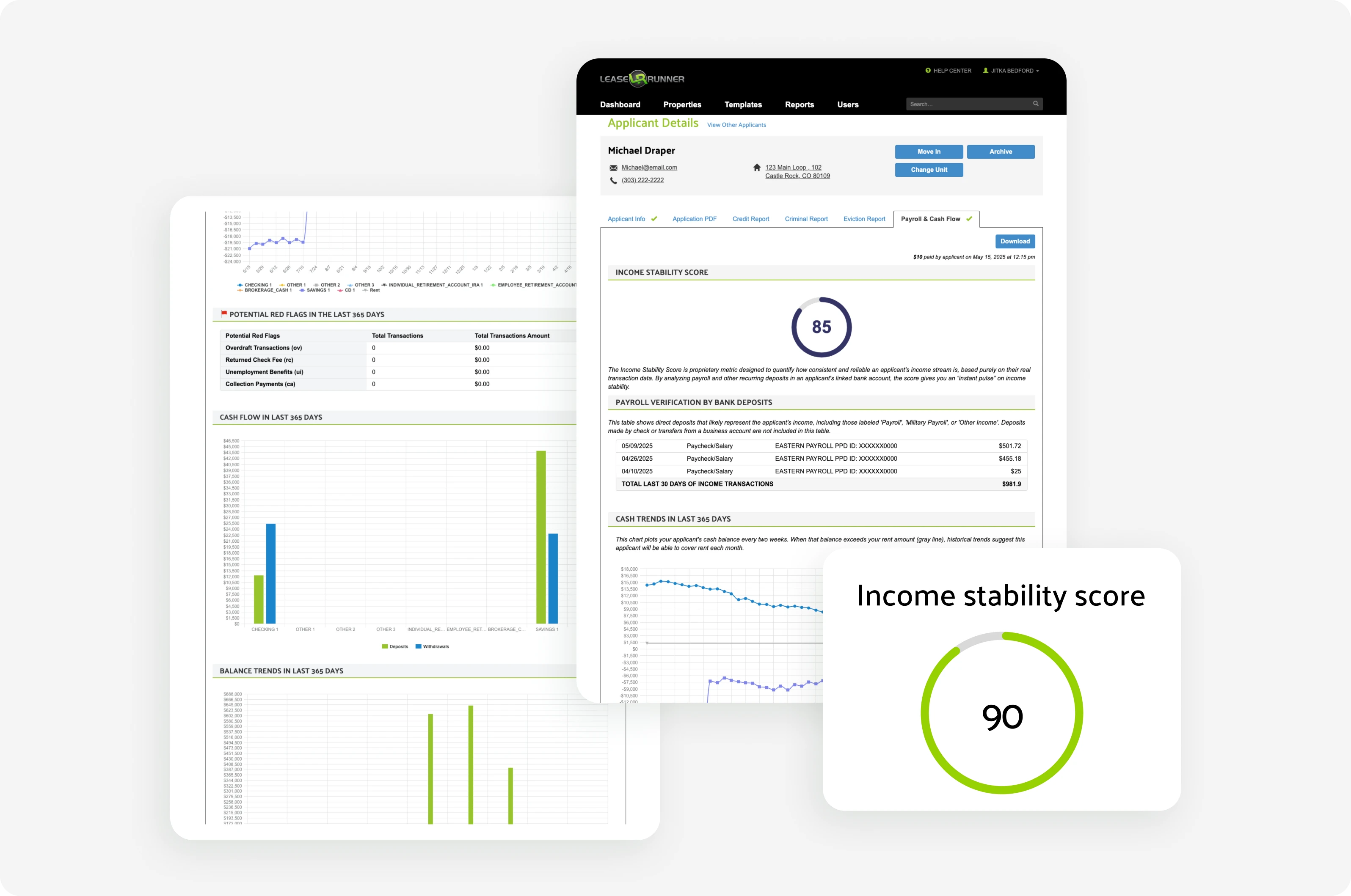 Shows recent paycheck deposits, 3-month earnings, and cash trends. It’s even faster and more reliable for landlords to verify your financial ability than credit checks.